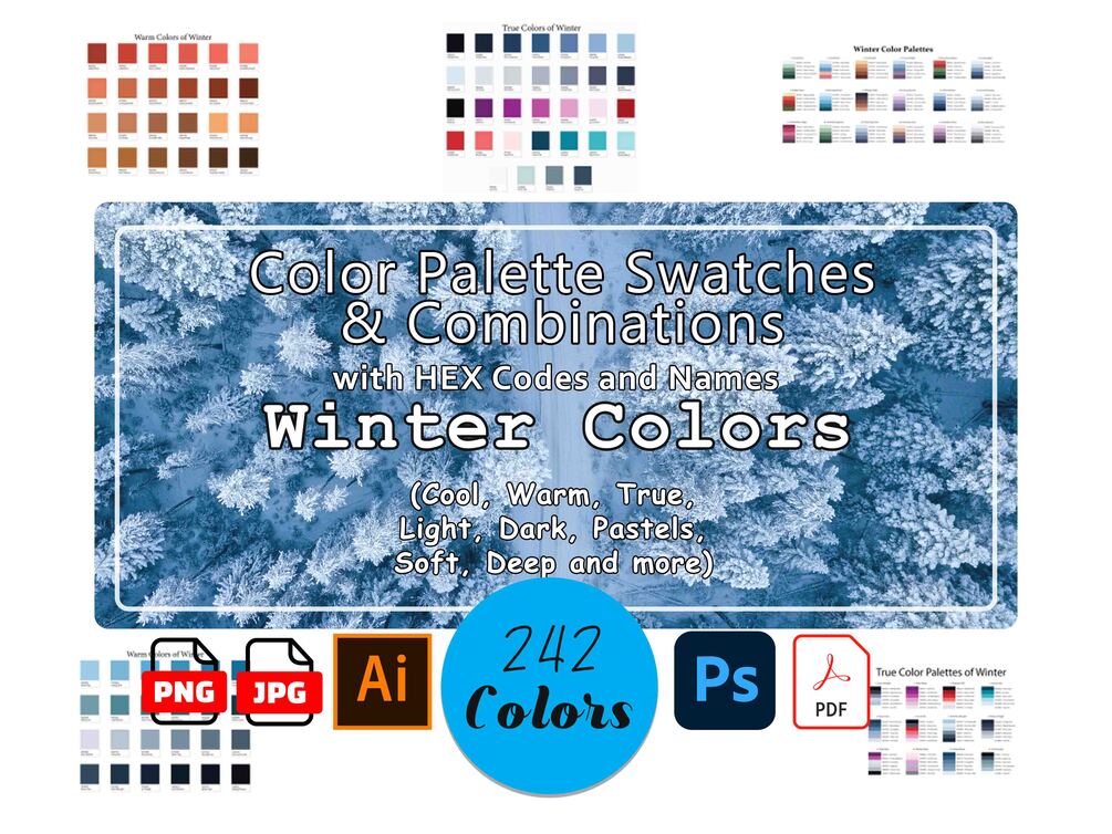 This Winter Color Palette bundle includes 242 curated colors in cool, warm, true, soft, light, dark, and colorful tones. You'll receive detailed Illustrator swatches and a complete color guide with names and HEX codes.