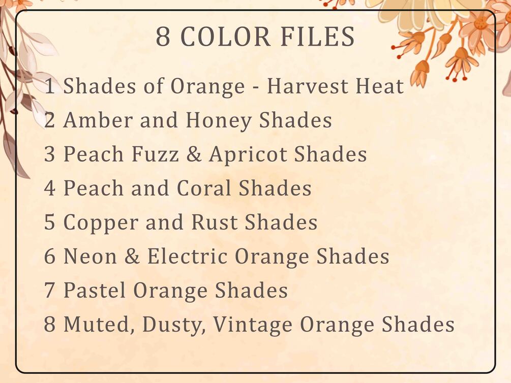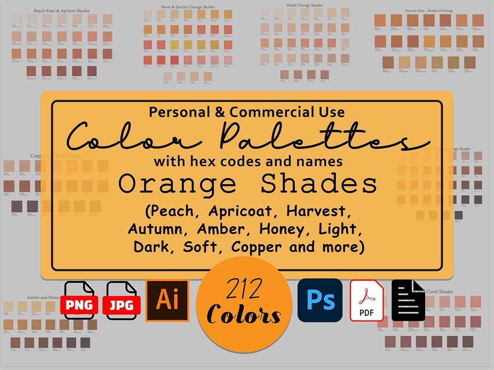 Discover the Shades of Orange Color Palette, a stunning collection of warm, earthy, and vibrant orange hues perfect for graphic design, branding, digital art, and more. This set features 212 carefully curated colors, ranging from soft peach and apricot to rich amber and honey tones. Whether you're working on an autumn-inspired project or need a warm color scheme, this collection has you covered!