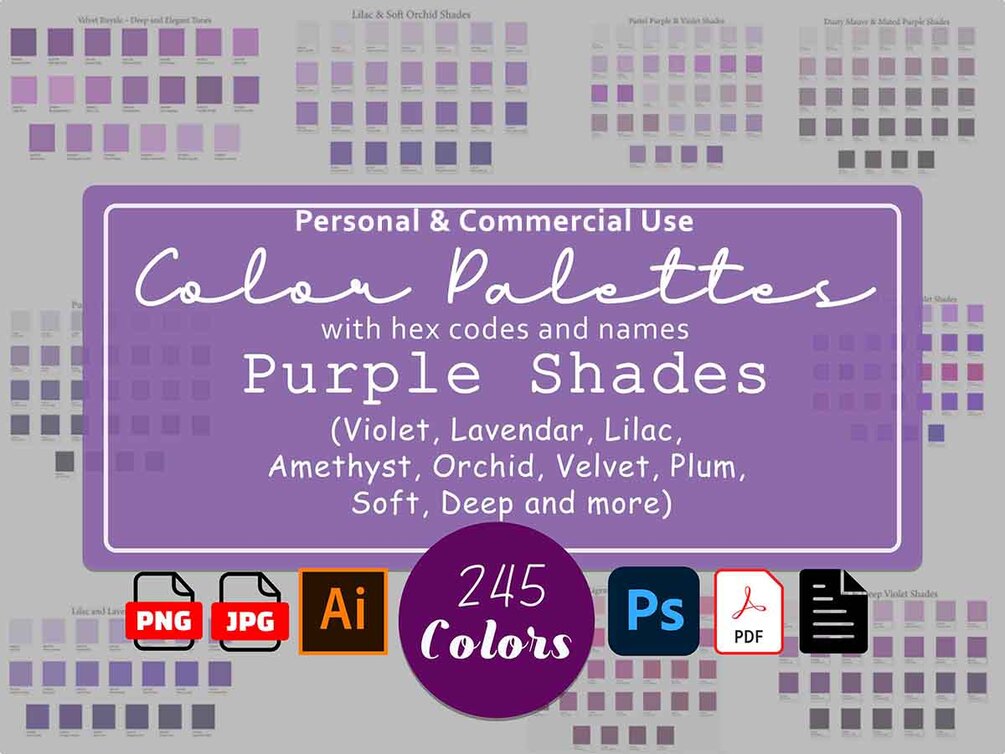Discover the ultimate Purple & Violet Shades Color Palette, featuring 252 stunning hues, tones, and color combinations! Perfect for graphic designers, branding, digital art, and creative projects, this purple color scheme is versatile and ready to enhance your designs.