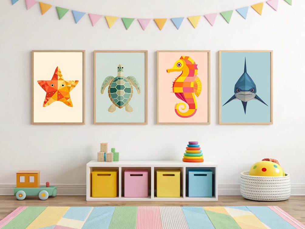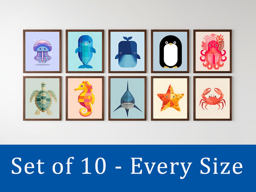 Make a splash in your child’s space with our Sea Animals Nursery Wall Art Prints, a vibrant kids room decor pack featuring geometric ocean illustrations of whale, sea turtle, shark, starfish, seahorse, penguin, crab, dolphin, jellyfish, and octopus. Perfect as printable nursery wall art, this collection brings a calm coastal vibe to any nursery or playroom. Each piece is a digital download wall art designed for easy printing and timeless ocean-inspired charm — ideal for nursery prints for boys and girls who love the sea.